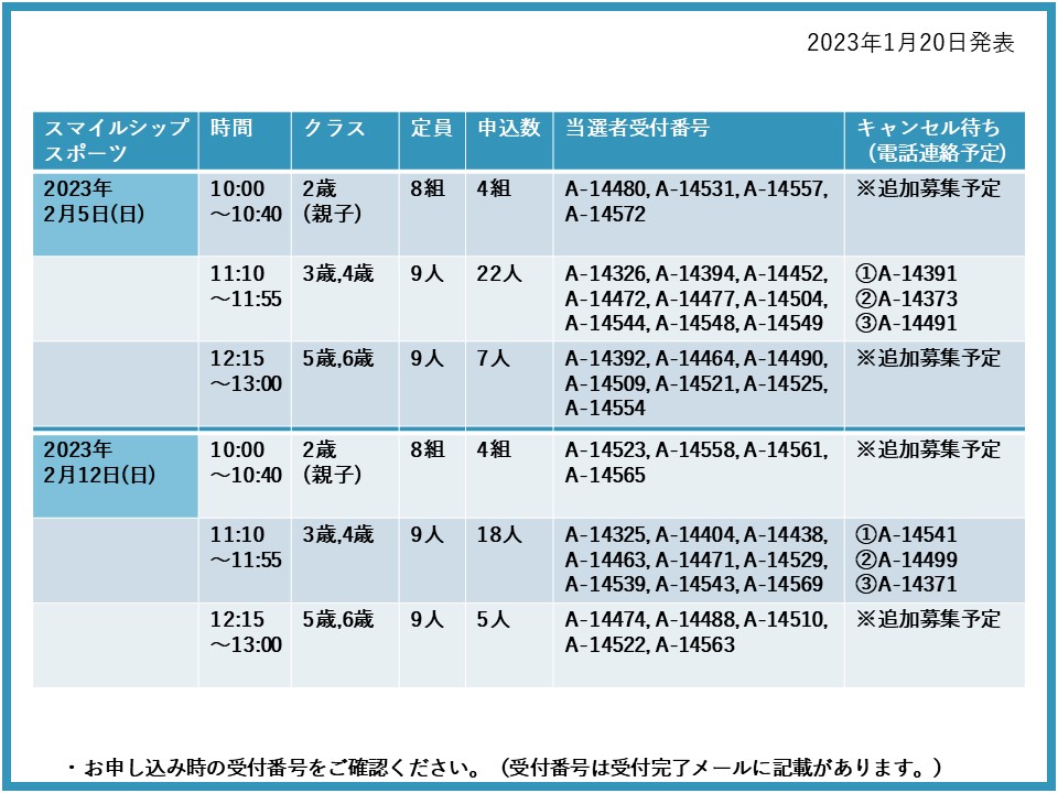 【当選発表ページ】スマイルシップスポーツ抽選申し込みについて抽選受付期間: 2023年1月14日(土) 10:00~1月17日(火) 10:00当選発表:2023年1月20日(金)17:00~下記よりご当選者の受付番号をご確認ください。▼2月5日(日)12日(日)