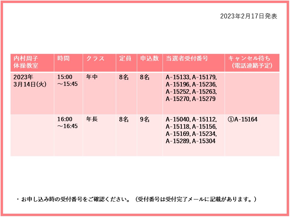 【当選発表ページ】内村周子体操教室抽選申し込みについて抽選受付期間: 2023年2月11日(土) 10:00~2月14日(火) 10:00当選発表:2023年2月17日(金)17:00~下記PDFファイルよりご当選者の受付番号をご確認ください。▼3月14日(火)年中クラス、年長クラス