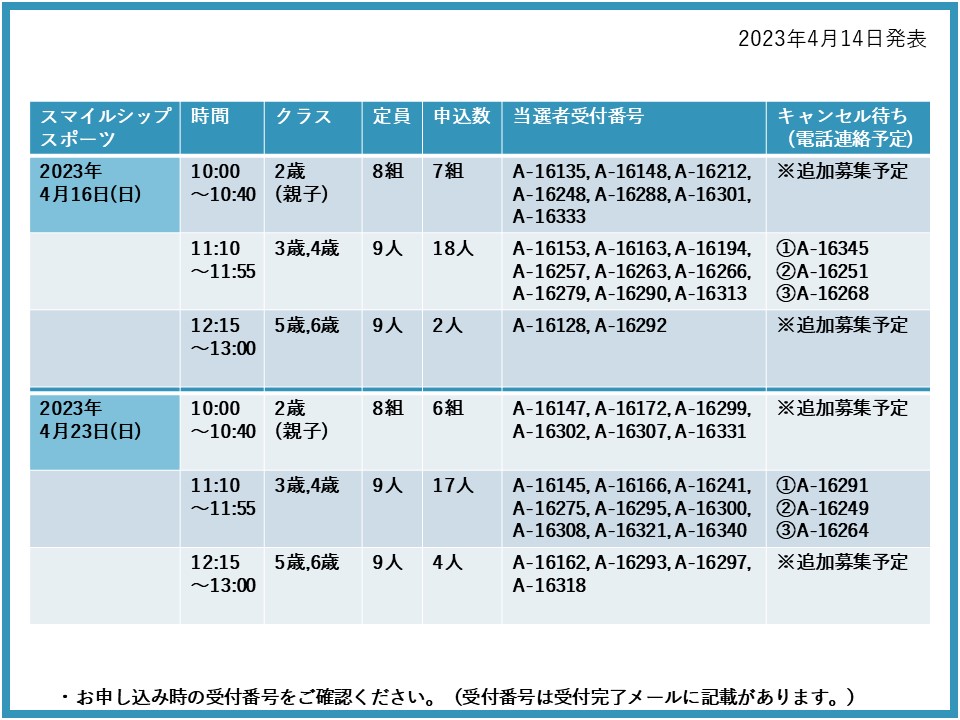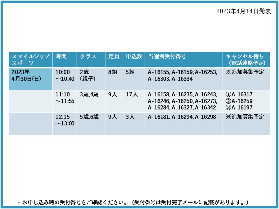 【当選発表ページ】スマイルシップスポーツ抽選申し込みについて抽選受付期間: 2023年4月8日(土) 10:00~4月11日(火) 10:00当選発表:2023年4月14日(金)17:00~下記よりご当選者の受付番号をご確認ください。▼4月16日(日)23日(日)30日(日)