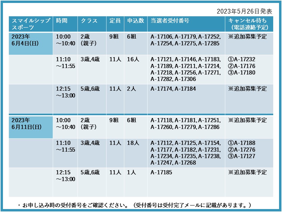 【当選発表ページ】スマイルシップスポーツ抽選申し込みについて抽選受付期間: 2023年5月20日(土) 10:00~5月23日(火) 10:00当選発表:2023年5月26日(金)17:00~下記よりご当選者の受付番号をご確認ください。▼6月4日(日)11日(日)
