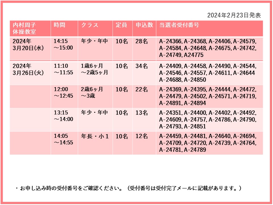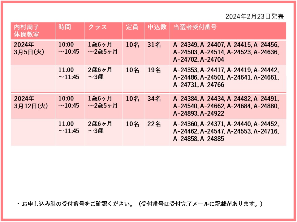 【当選発表ページ】内村周子体操教室抽選申し込みについて抽選受付期間: 2024年2月15日(木) 12:00~2月20日(火) 10:00当選発表:2024年2月23日(金)17:00~下記よりご当選者の受付番号をご確認ください。▼3月5日(火)12日(火)20(水)26日(火)27日(水)