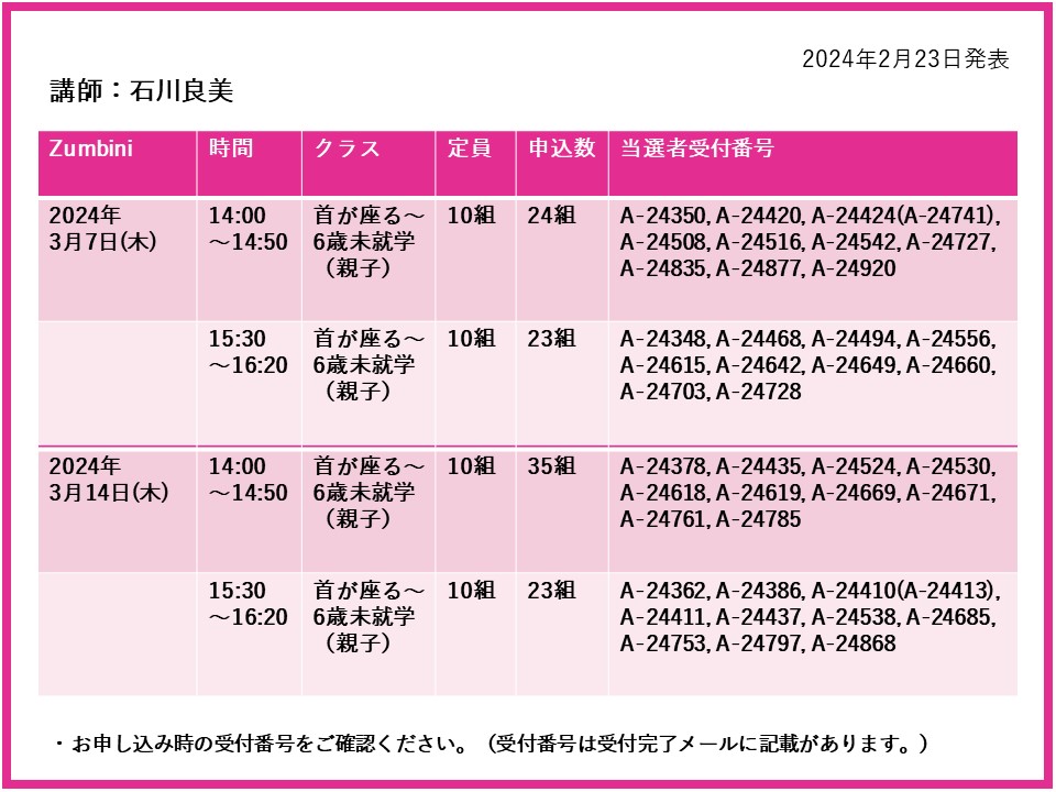 【当選発表ページ】Zumbini抽選申し込みについて抽選受付期間: 2024年2月15日(木) 12:00~2月20日(火) 10:00当選発表:2024年2月23日(金)17:00~下記よりご当選者の受付番号をご確認ください。▼3月7日(木)14(木)
