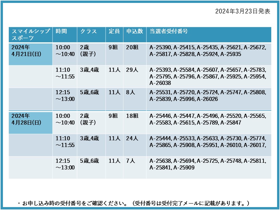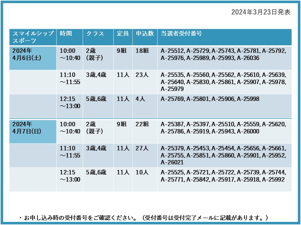 【当選発表ページ】スマイルシップスポーツ抽選申し込みについて抽選受付期間: 2024年3月15日(金) 12:00~3月20日(水) 10:00当選発表:2024年3月23日(土)17:00~下記よりご当選者の受付番号をご確認ください。▼4月6日(土)7日(日)13日(土)14日(日)21日(日)28日(日)