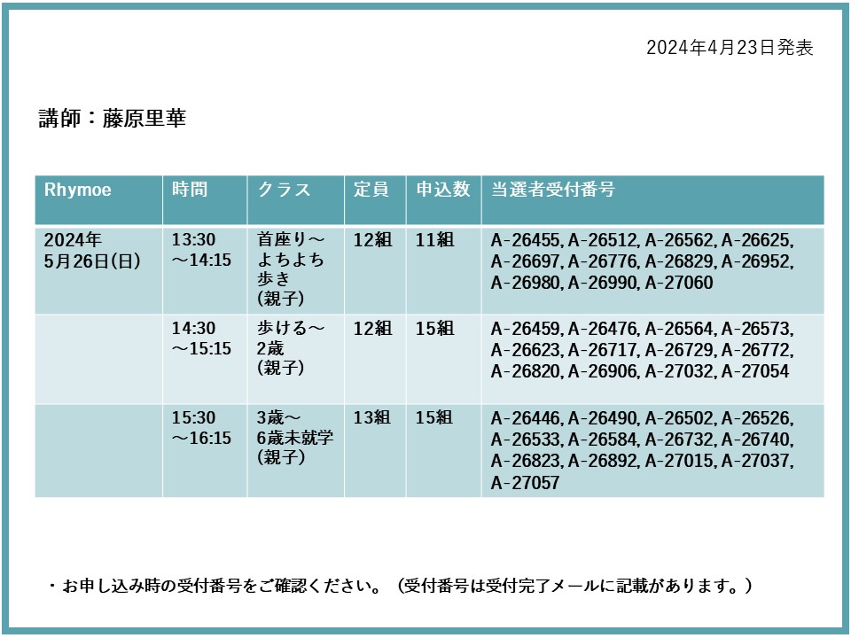 【当選発表ページ】 Rhymoe抽選申し込みについて抽選受付期間: 2024年4月15日(月) 12:00~4月20日(土) 10:00当選発表:2024年4月23日(火)17:00~下記よりご当選者の受付番号をご確認ください。▼藤原里華 5月12日(日)26日(日)