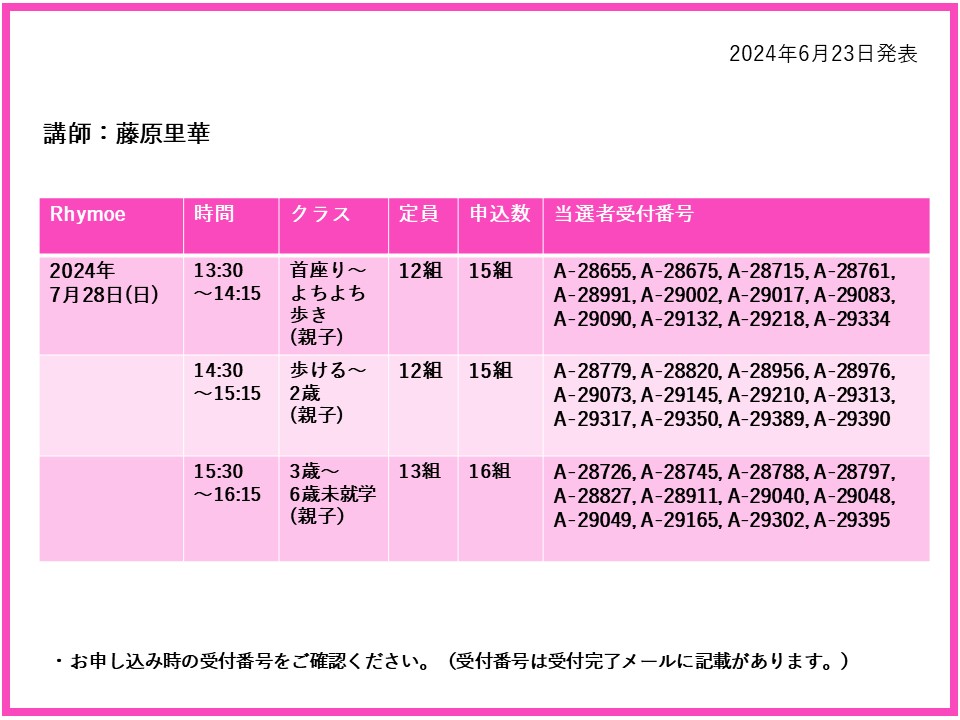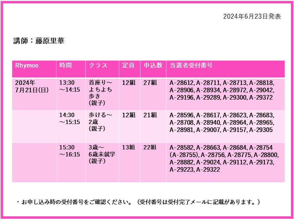 【当選発表ページ】 Rhymoe抽選申し込みについて抽選受付期間: 2024年6月15日(土) 12:00~6月20日(木) 10:00当選発表:2024年6月23日(日)17:00~下記よりご当選者の受付番号をご確認ください。▼藤原里華 7月21日(日)28日(日)