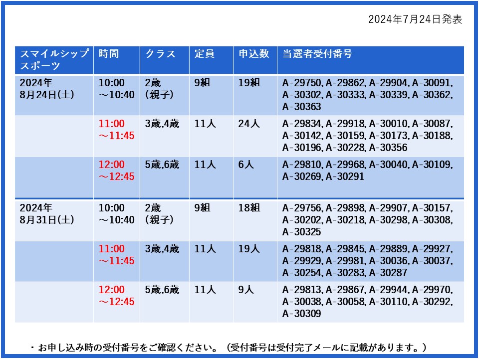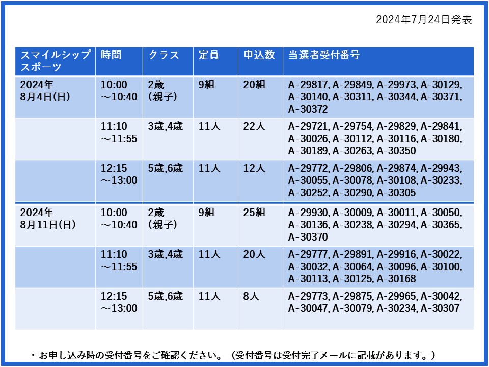 【当選発表ページ】スマイルシップスポーツ抽選申し込みについて抽選受付期間: 2024年7月15日(月) 12:00~7月20日(土) 10:00当選発表:2024年7月24日(水)17:00~下記よりご当選者の受付番号をご確認ください。▼8月4日(日)11日(日)24日(土)31日(土)