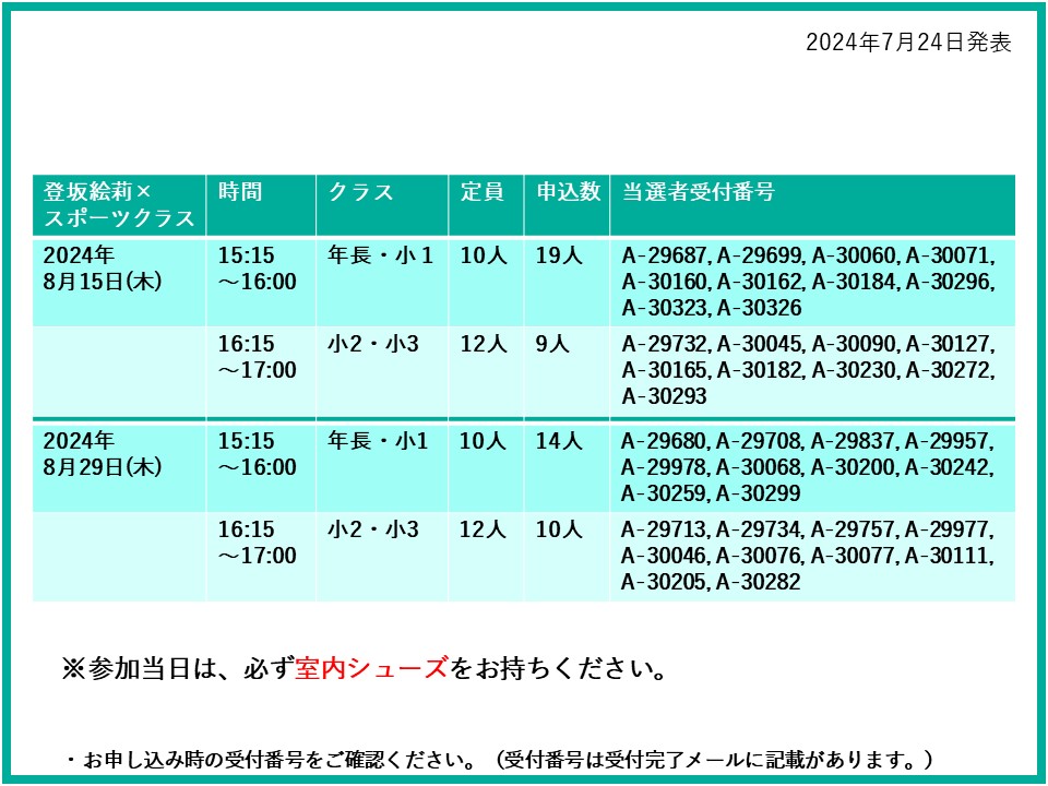 【当選発表ページ】登坂絵莉×スポーツクラス抽選申し込みについて抽選受付期間: 2024年7月15日(月) 12:00~7月20日(土) 10:00当選発表:2024年7月24日(水) 17:00~下記よりご当選者の受付番号をご確認ください。▼8月15日(木)29日(木)