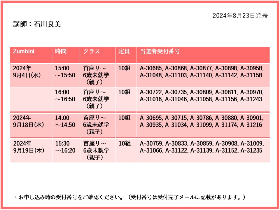 【当選発表ページ】Zumbini抽選申し込みについて抽選受付期間: 2024年8月15日(木) 12:00~8月20日(火) 10:00当選発表:2024年8月23日(金)17:00~下記よりご当選者の受付番号をご確認ください。▼9月4日(水)18日(水)19日(木)