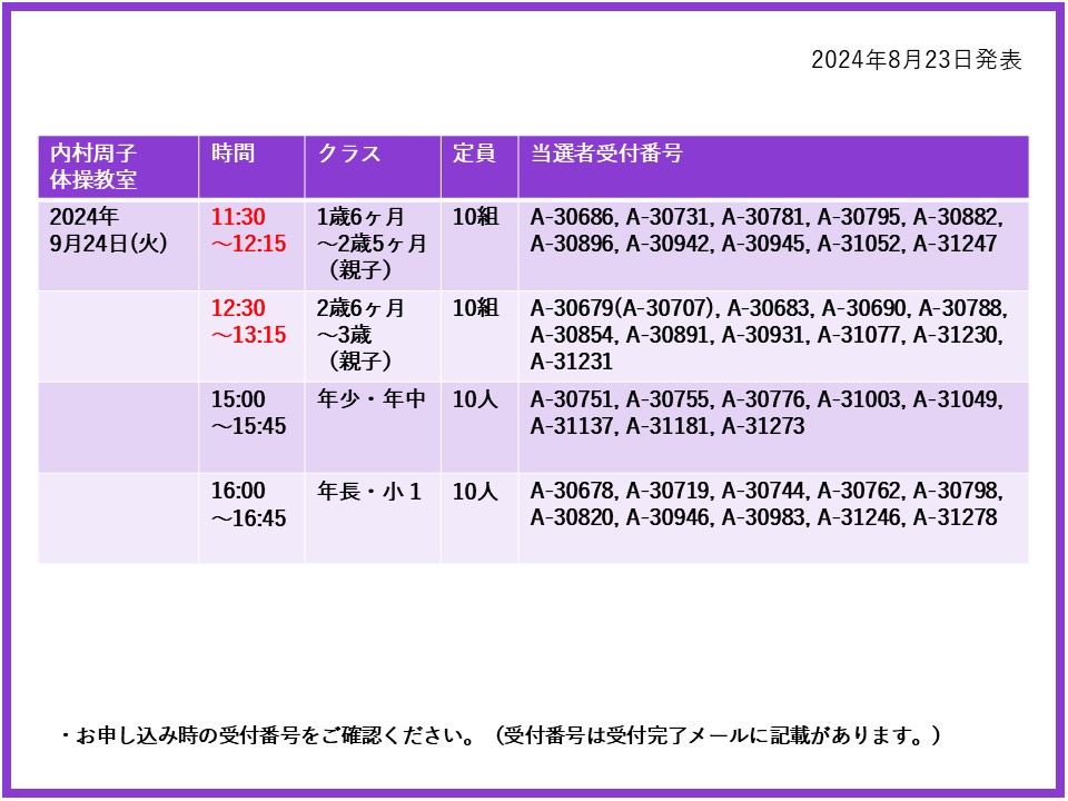 【当選発表ページ】内村周子体操教室抽選申し込みについて抽選受付期間: 2024年8月15日(木) 12:00~8月20日(火) 10:00当選発表:2024年8月23日(金)17:00~下記よりご当選者の受付番号をご確認ください。▼9月24日(火)26日(木)