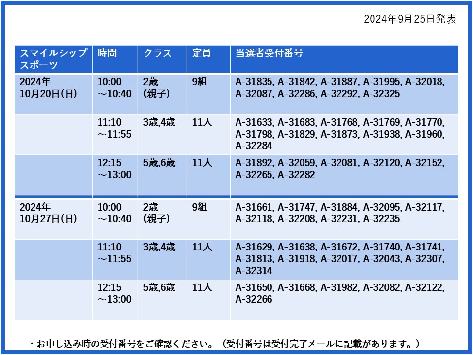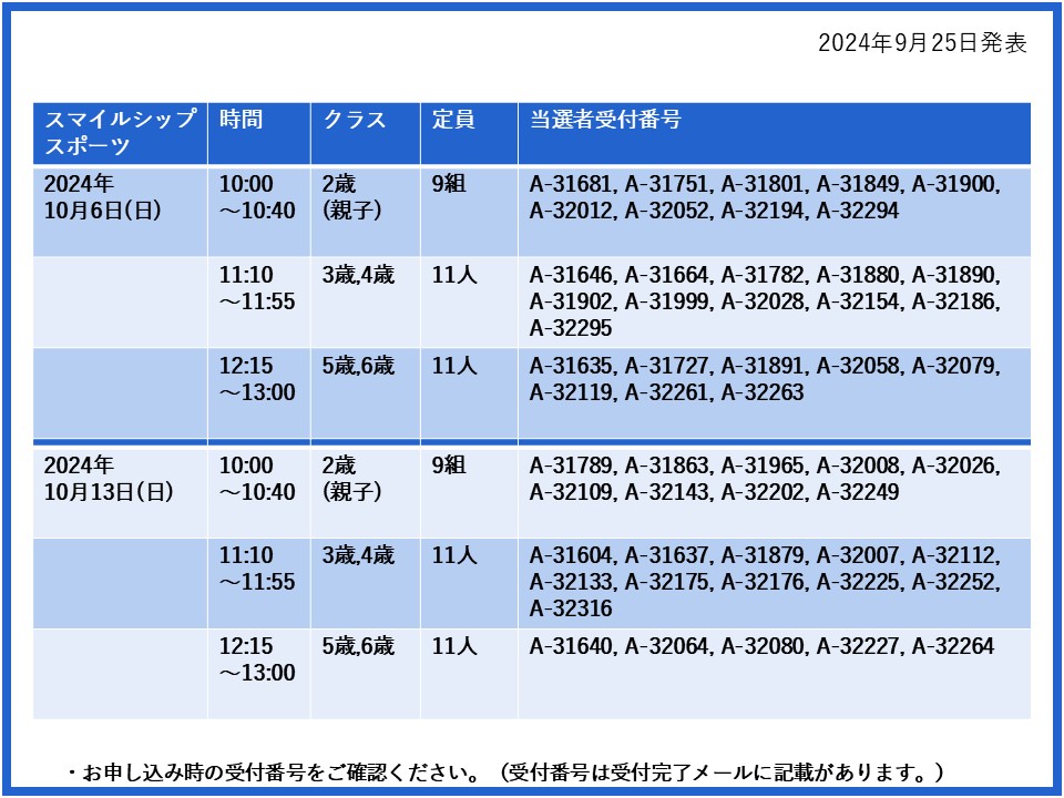 【当選発表ページ】スマイルシップスポーツ抽選申し込みについて抽選受付期間: 2024年9月15日(日) 12:00~9月20日(金) 10:00当選発表:2024年9月25日(水)17:00~下記よりご当選者の受付番号をご確認ください。▼10月6日(日)13日(日)20日(日)27日(日)
