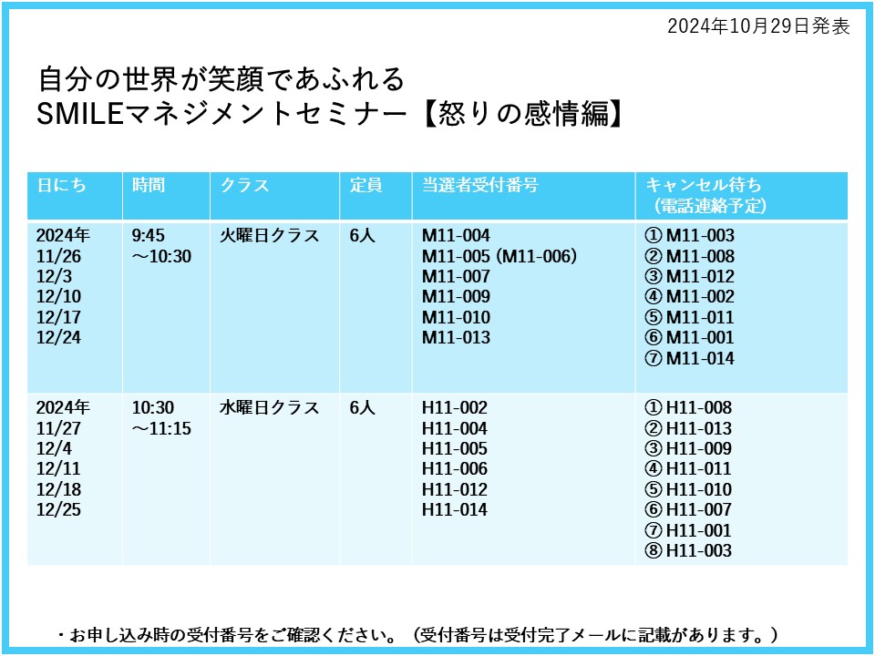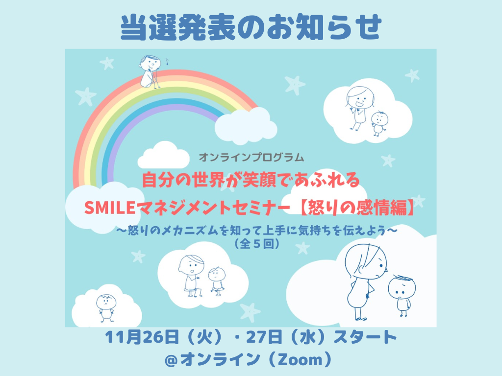 11月スタート<全5回>の「自分の世界が笑顔であふれるSMILEマネジメントセミナー【怒りの感情編】」には、大変たくさんの方よりお申込みいただきありがとうございます。