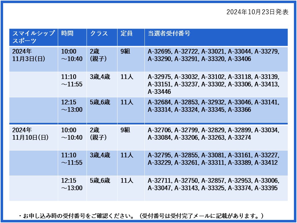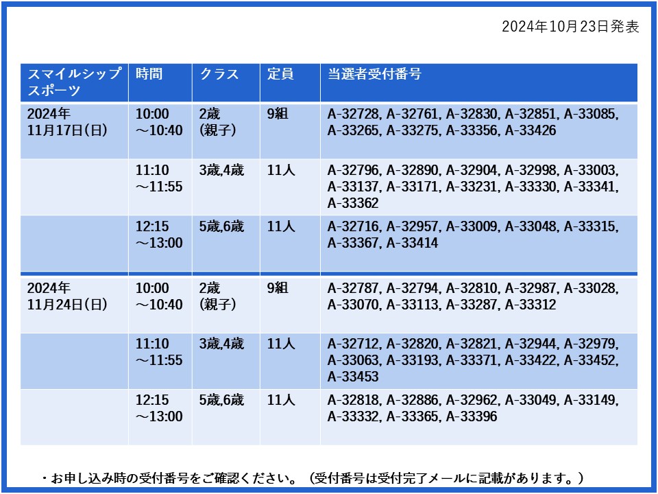 【当選発表ページ】スマイルシップスポーツ抽選申し込みについて抽選受付期間: 2024年10月15日(火) 12:00~10月20日(日) 10:00当選発表:2024年10月23日(水)17:00~下記よりご当選者の受付番号をご確認ください。▼11月3日(日)10日(日)17日(日)24日(日)