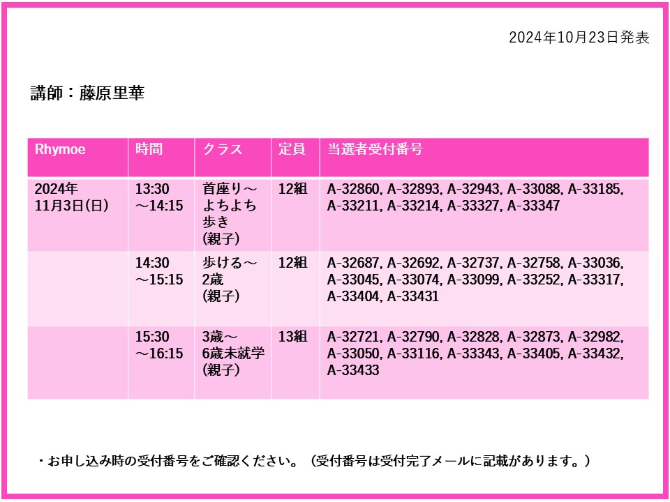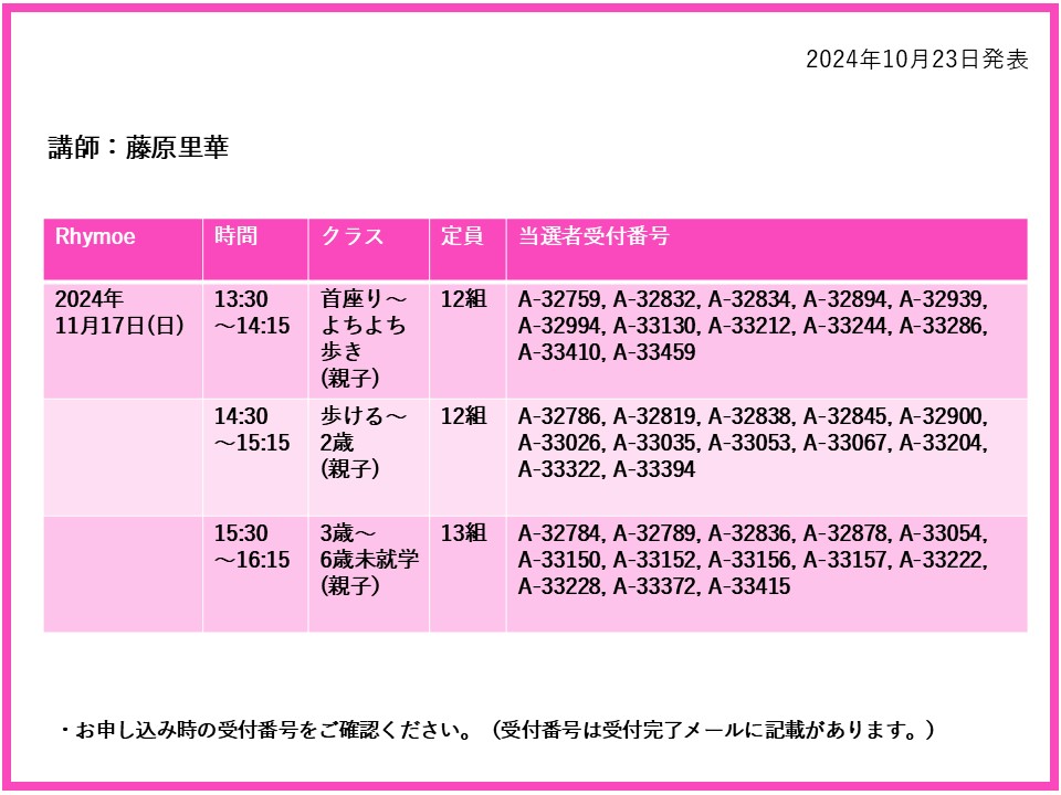 【当選発表ページ】 Rhymoe抽選申し込みについて抽選受付期間: 2024年10月15日(火) 12:00~10月20日(日) 10:00当選発表:2024年10月23日(水)17:00~下記よりご当選者の受付番号をご確認ください。▼藤原里華 11月3日(日)17日(日)