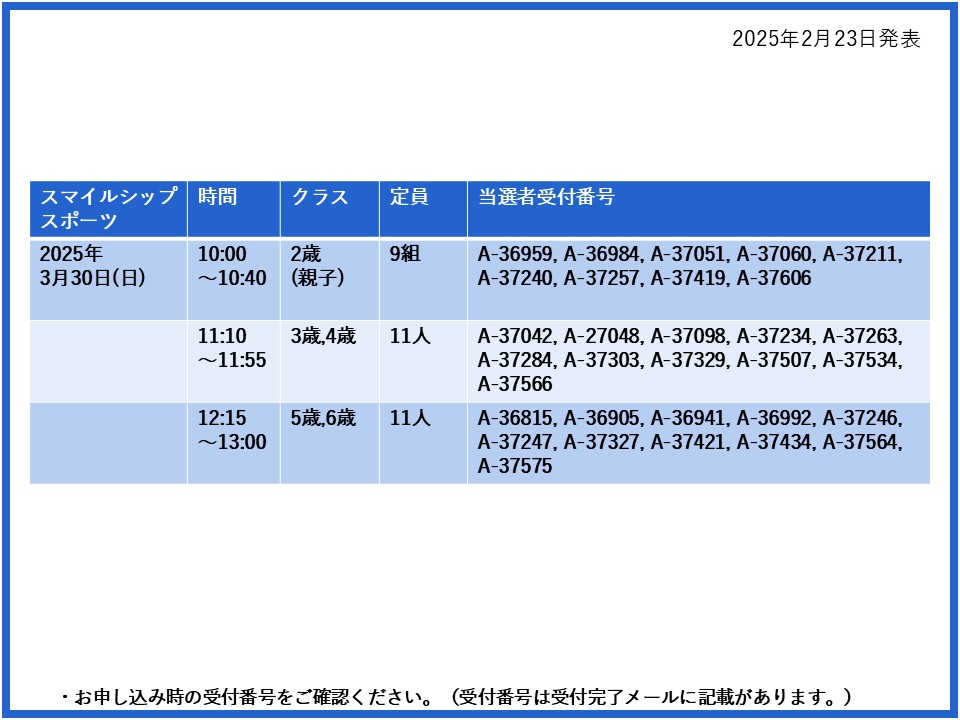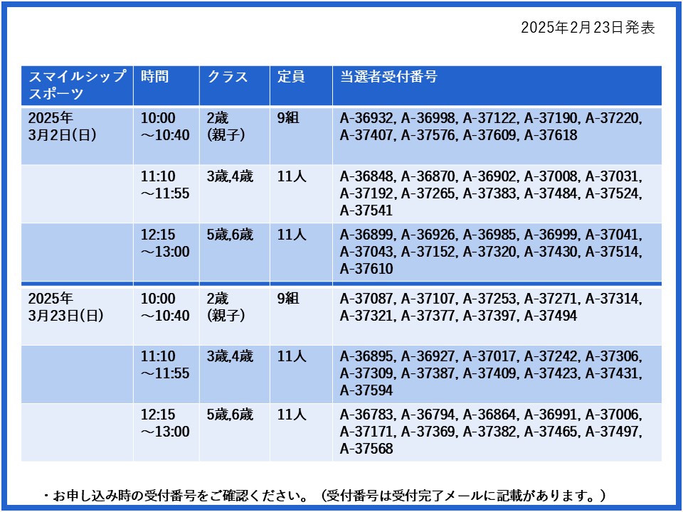 【当選発表ページ】スマイルシップスポーツ抽選申し込みについて抽選受付期間:2025年2月15日(土) 12:00~2月21日(金) 10:00当選発表:2025年2月23日(日)17:00~下記よりご当選者の受付番号をご確認ください。▼3月2日(日)23日(日)30日(日)