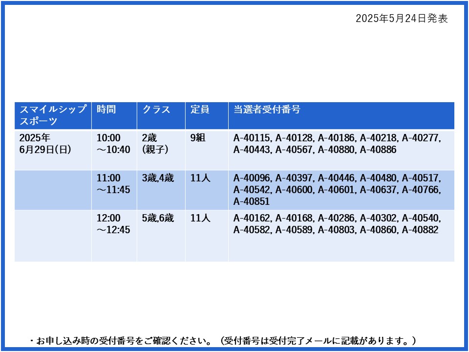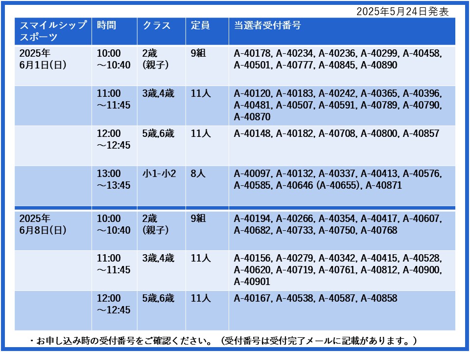 【当選発表ページ】スマイルシップスポーツ抽選申し込みについて抽選受付期間:2025年5月15日(木) 12:00~5月20日(火) 10:00当選発表:2025年5月24日(土)17:00~下記よりご当選者の受付番号をご確認ください。▼6月1日(日)8日(日)15日(日)22日(日)29日(日)