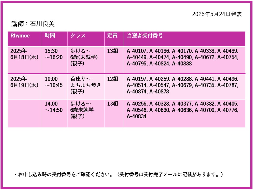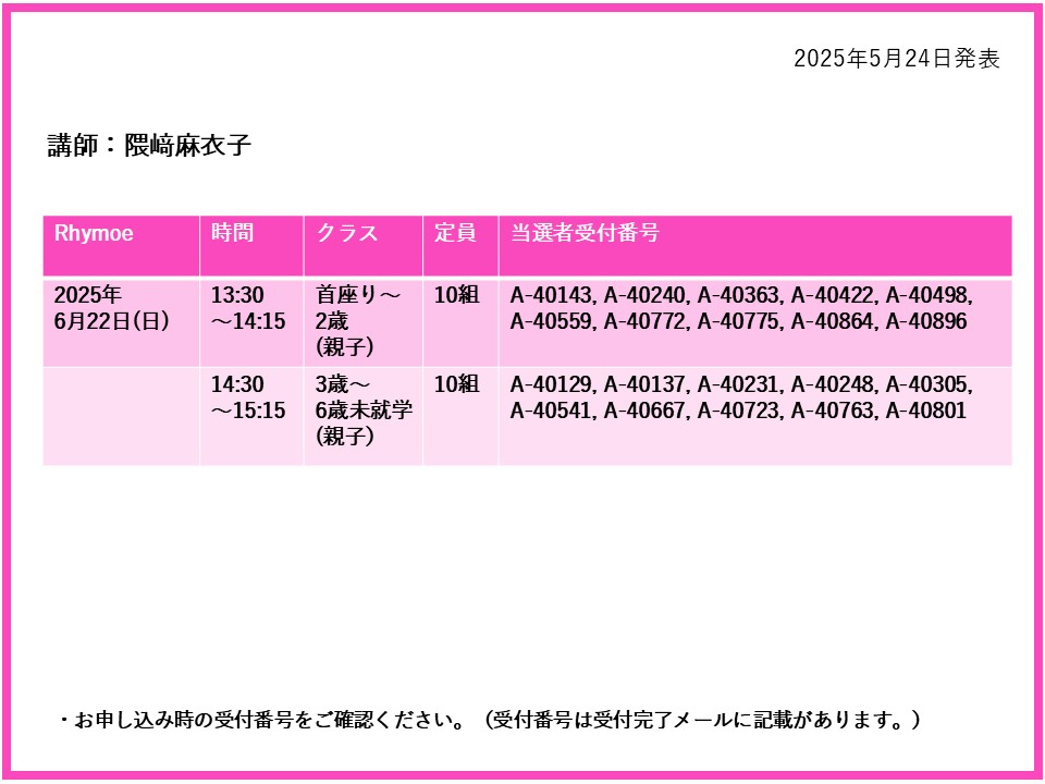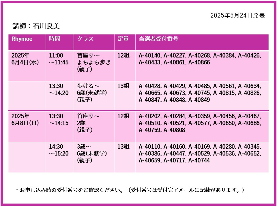【当選発表ページ】 Rhymoe抽選申し込みについて抽選受付期間:2025年5月15日(木) 12:00~5月20日(火) 10:00当選発表:2025年5月24日(土)17:00~下記よりご当選者の受付番号をご確認ください。▼石川良美 6月4日(水)8日(日)18日(水)19日(木) ▼隈﨑麻衣子 6月22日(日)