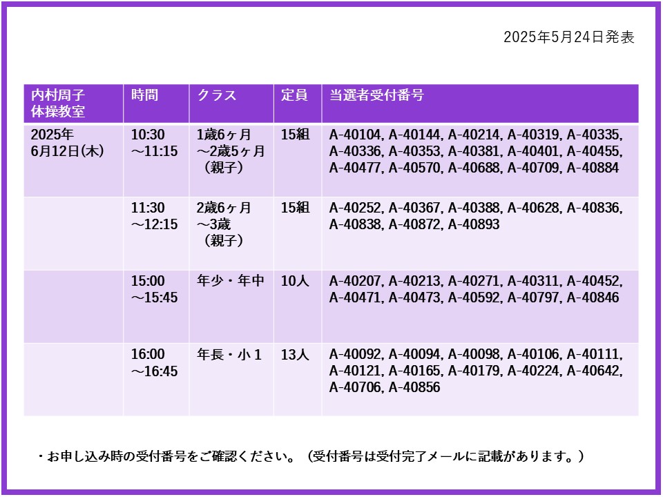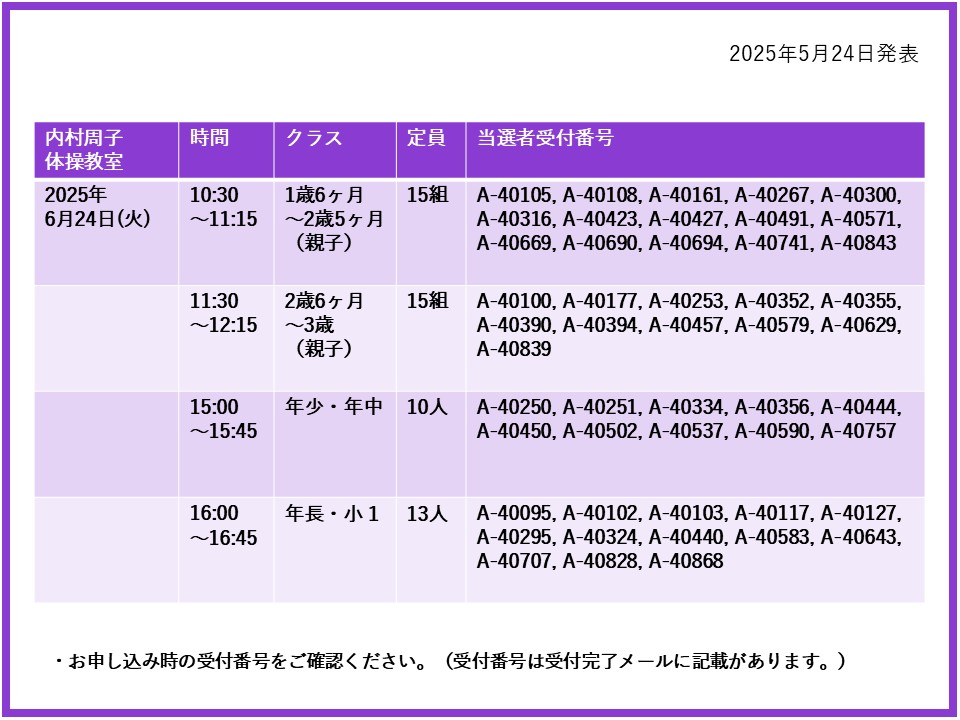 【当選発表ページ】内村周子体操教室抽選申し込みについて抽選受付期間:2025年5月15日(木) 12:00~5月20日(火) 10:00当選発表:2025年5月24日(土)17:00~下記よりご当選者の受付番号をご確認ください。▼6月12日(木)24日(火)