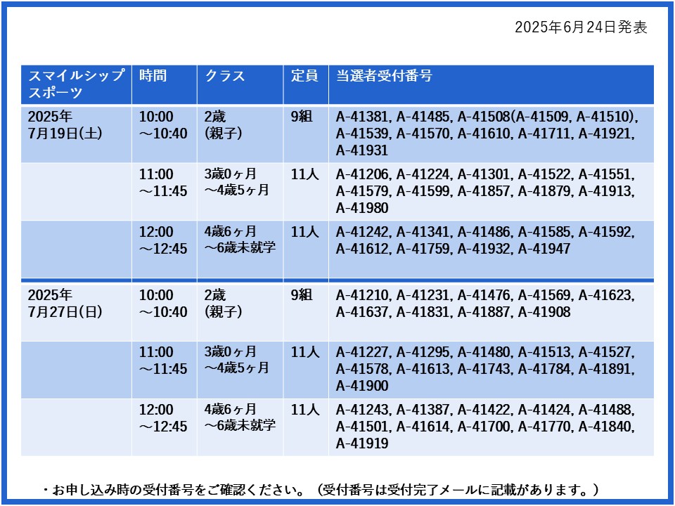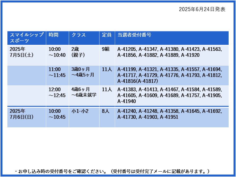 【当選発表ページ】スマイルシップスポーツ抽選申し込みについて抽選受付期間:2025年6月15日(日) 12:00~6月20日(金) 10:00当選発表:2025年6月24日(火)17:00~下記よりご当選者の受付番号をご確認ください。▼7月5日(土)6日(日)19日(土)27日(日)