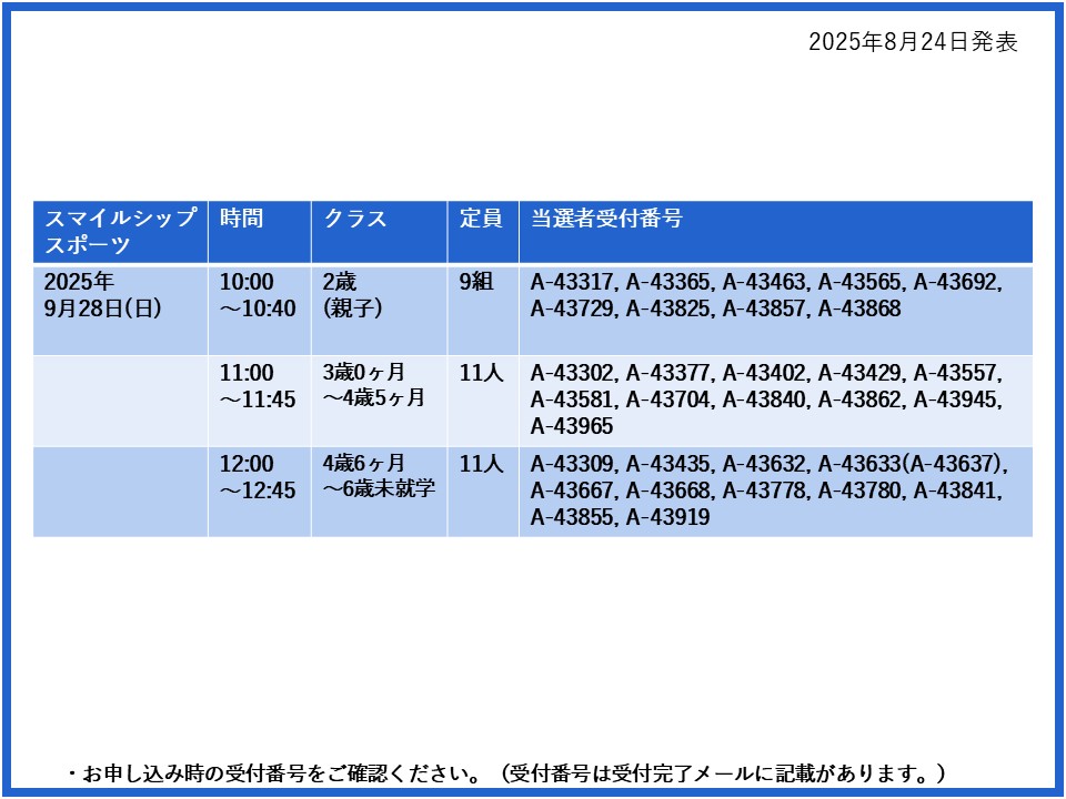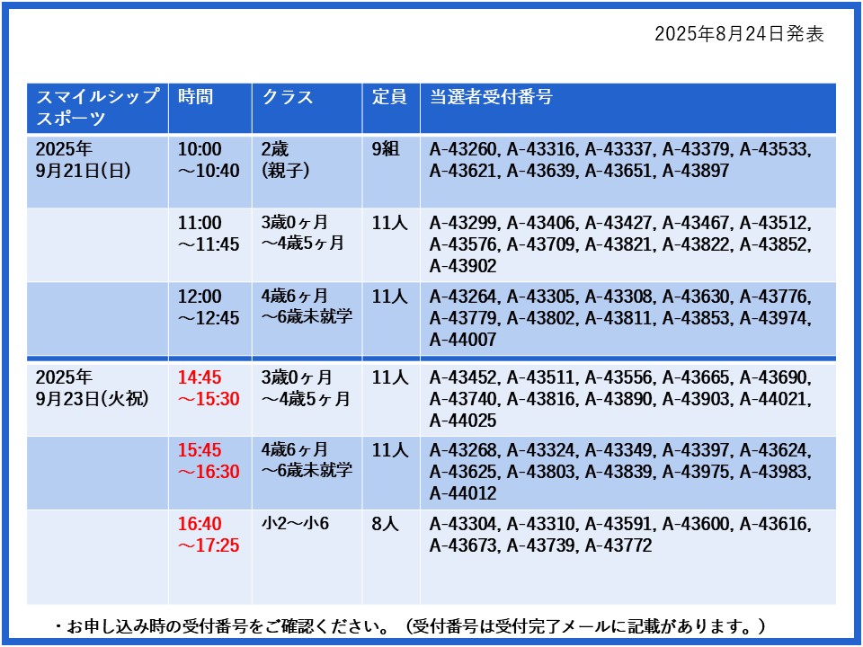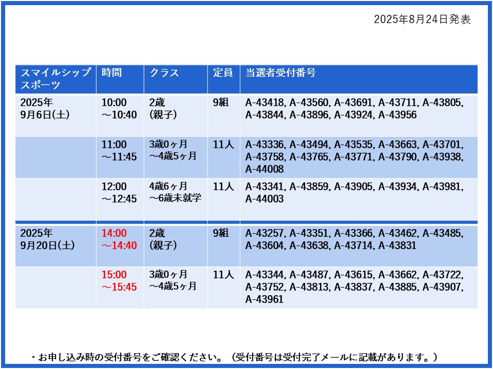 【当選発表ページ】スマイルシップスポーツ抽選申し込みについて抽選受付期間:2025年8月15日(金) 12:00~8月20日(水) 10:00当選発表:2025年8月24日(日)17:00~下記よりご当選者の受付番号をご確認ください。▼9月6日(土)20日(土)21日(日)23日(火祝)28日(日)