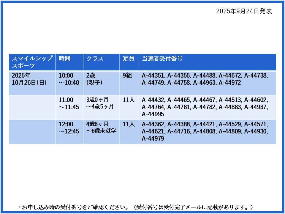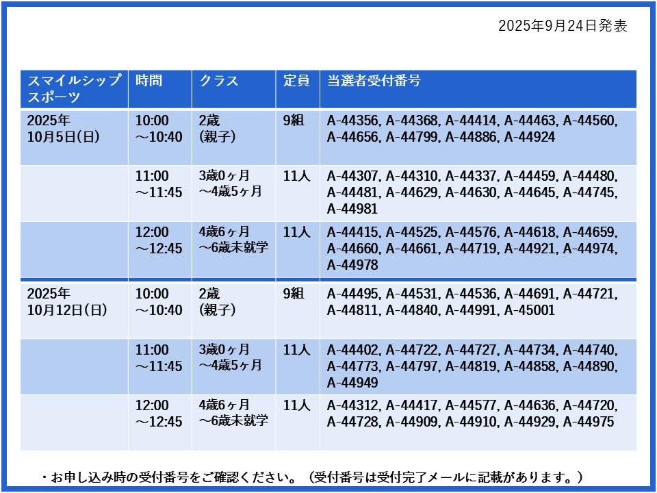 【当選発表ページ】スマイルシップスポーツ抽選申し込みについて抽選受付期間:2025年9月15日(月) 12:00~9月20日(土) 10:00当選発表:2025年9月24日(水)17:00~下記よりご当選者の受付番号をご確認ください。▼10月5日(日)12日(日)26日(日)