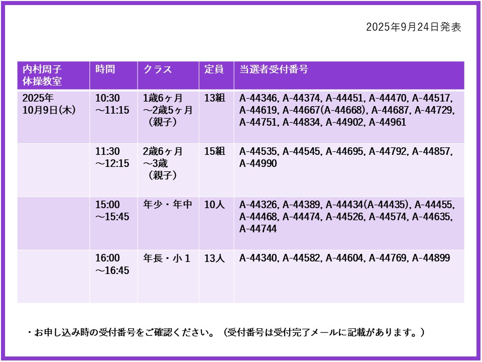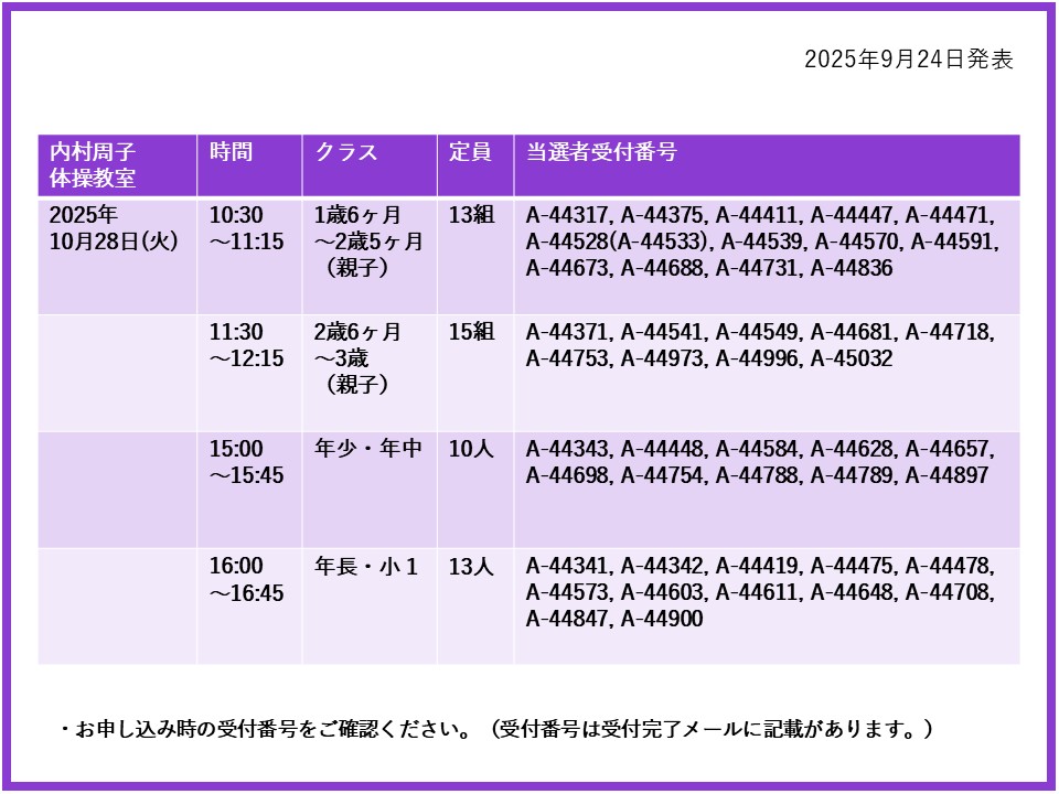 【当選発表ページ】内村周子体操教室抽選申し込みについて抽選受付期間:2025年9月15日(月) 12:00~9月20日(土) 10:00当選発表:2025年9月24日(水)17:00~下記よりご当選者の受付番号をご確認ください。▼10月9日(木)28日(火)