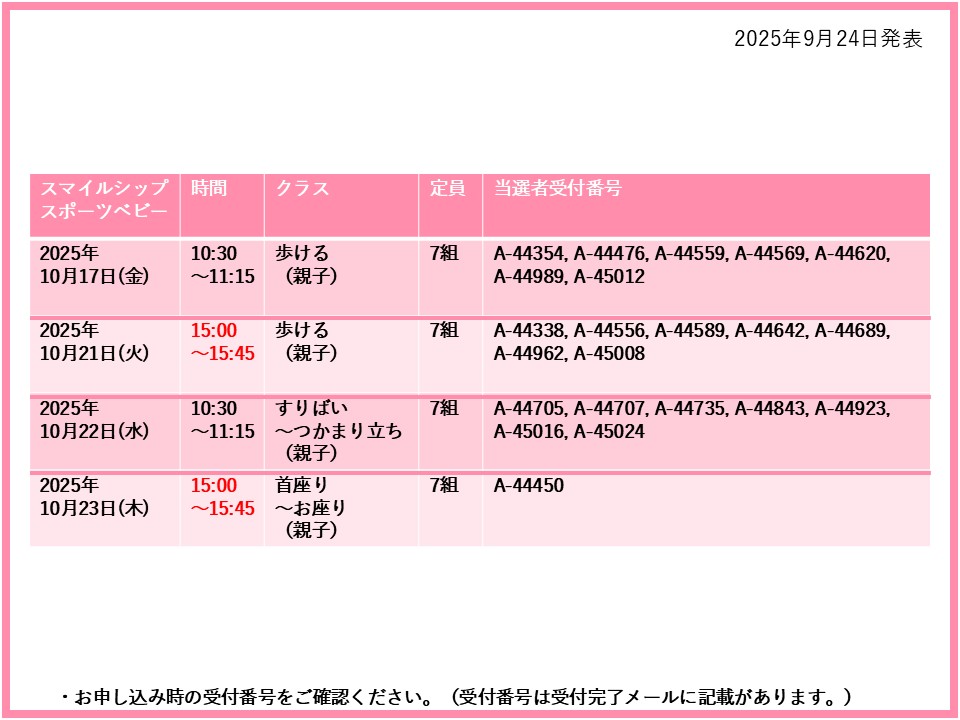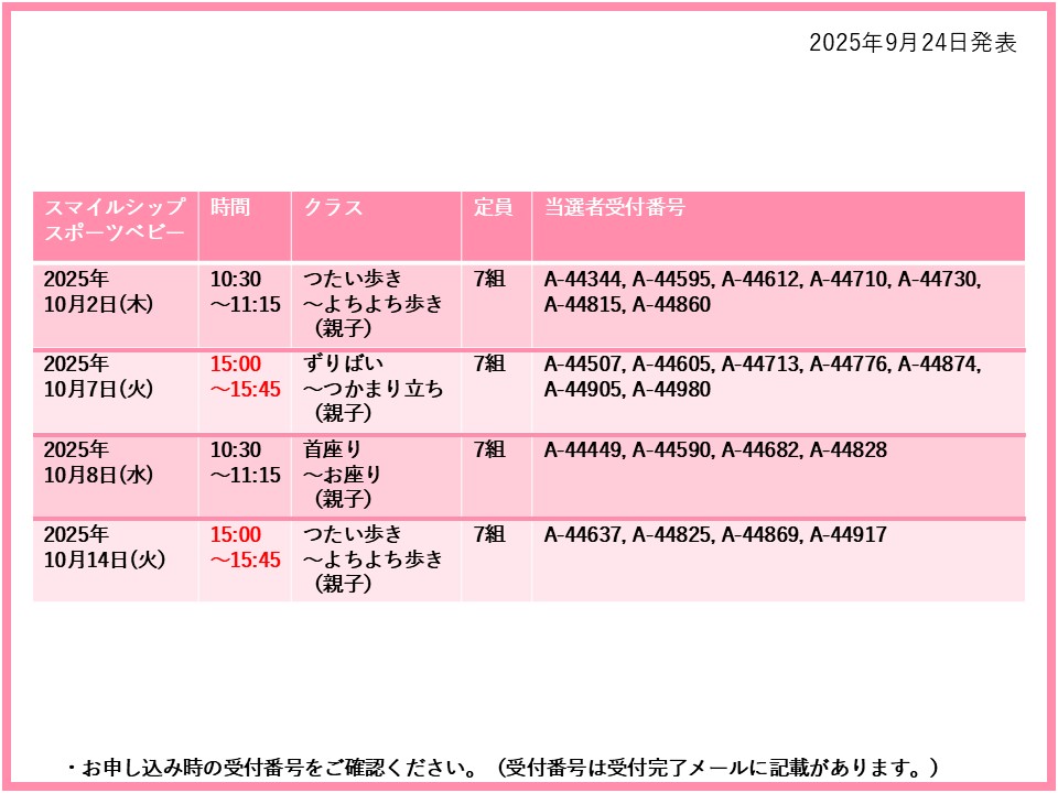 【当選発表ページ】スマイルシップスポーツベビー抽選申し込みについて抽選受付期間:2025年9月15日(月) 12:00~9月20日(土) 10:00当選発表:2025年9月24日(水)17:00~下記よりご当選者の受付番号をご確認ください。▼10月2日(木)7日(火)8日(水)14日(火)17日(金)21日(火)22日(水)23日(木)