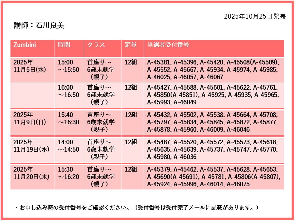 【当選発表ページ】Zumbini抽選申し込みについて抽選受付期間:2025年10月15日(水) 12:00~10月21日(火) 10:00当選発表:2025年10月25日(土)17:00~下記よりご当選者の受付番号をご確認ください。▼11月5日(水)9日(日)19日(水)20日(木)