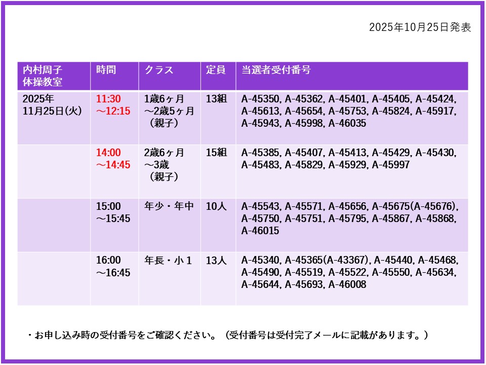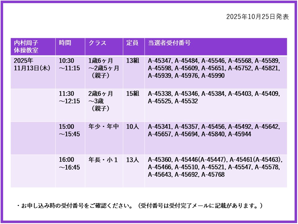 【当選発表ページ】内村周子体操教室抽選申し込みについて抽選受付期間:2025年10月15日(水) 12:00~10月21日(火) 10:00当選発表:2025年10月25日(土)17:00~下記よりご当選者の受付番号をご確認ください。▼11月13日(木)25日(火)