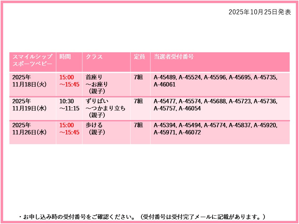【当選発表ページ】スマイルシップスポーツベビー抽選申し込みについて抽選受付期間:2025年10月15日(水) 12:00~10月21日(火) 10:00当選発表:2025年10月25日(土)17:00~下記よりご当選者の受付番号をご確認ください。▼11月4日(火)6日(木)11日(火)12日(水)18日(火)19日(水)26日(水)
