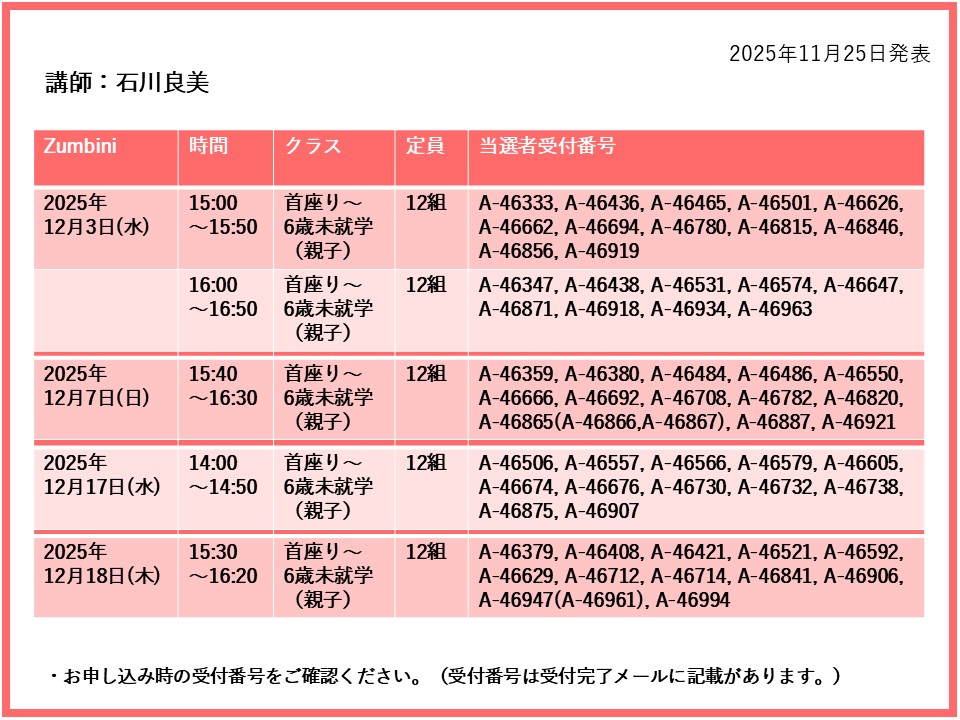 【当選発表ページ】Zumbini抽選申し込みについて抽選受付期間:2025年11月15日(土) 12:00~11月21日(金) 10:00当選発表:2025年11月25日(火)17:00~下記よりご当選者の受付番号をご確認ください。▼12月3日(水)7日(日)17日(水)18日(木)