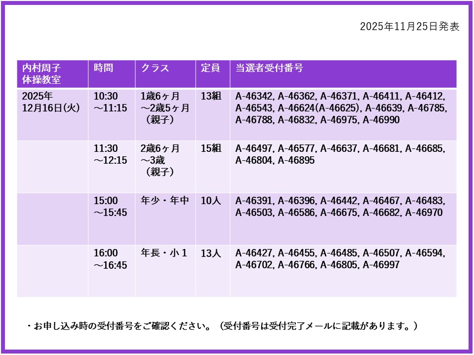 【当選発表ページ】内村周子体操教室抽選申し込みについて抽選受付期間:2025年11月15日(土) 12:00~11月21日(金) 10:00当選発表:2025年11月25日(火)17:00~下記よりご当選者の受付番号をご確認ください。▼12月11日(木)16日(火)