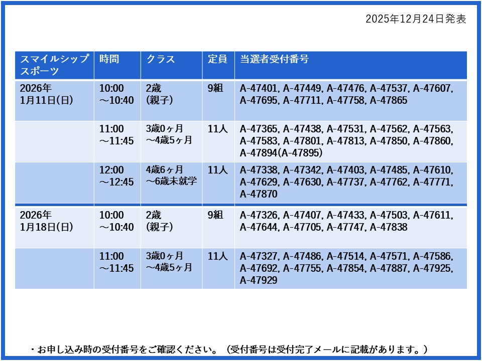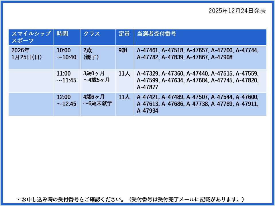 【当選発表ページ】スマイルシップスポーツ抽選申し込みについて抽選受付期間:2025年12月15日(月) 12:00~12月20日(土) 10:00当選発表:2025年12月24日(水)17:00~下記よりご当選者の受付番号をご確認ください。▼1月11日(日)18日(日)25日(日)