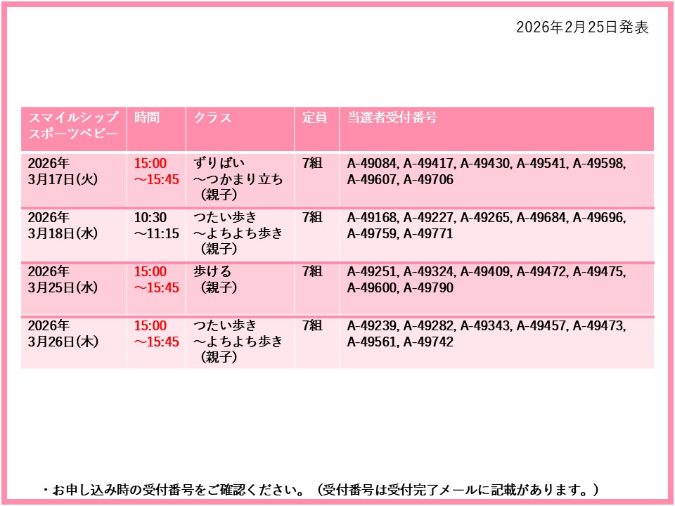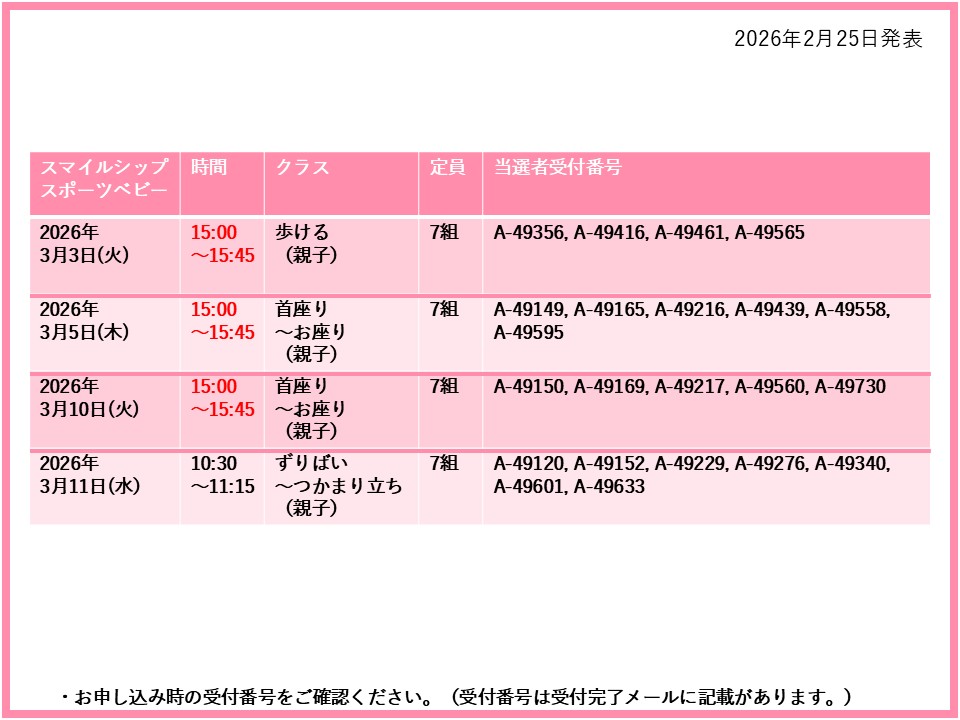 【当選発表ページ】スマイルシップスポーツベビー抽選申し込みについて抽選受付期間:2026年2月15日(日) 12:00~2月20日(金) 10:00当選発表:2026年2月25日(水)17:00~下記よりご当選者の受付番号をご確認ください。▼3月3日(火)5日(木)10日(火)11日(水)17日(火)18日(水)25日(水)26日(木)