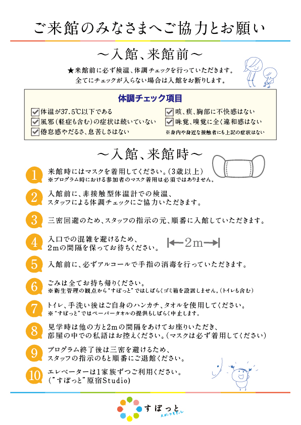 最新情報はWEB、SNS等でお知らせしますので、随時ご確認をお願いします。※年末年始休館 12月28日(月)~1月4日(月)1)受付開始・開催日1月1日~1月15日<受付開始12月11日(金)10時より>・開催日1月16日~1月31日<受付開始12月25日(金)10時より>※抽選プログラムの受付期間は受付開始日から1週間です。 >>抽選申し込みについて2)申し込み①渋谷“すぽっと”(千駄ヶ谷)>>②”すぽっと”原宿studio>>③オンラインセミナー(Zoom)・申し込みページの留意事項>>は必ずお読みください。・渋谷区(在住・在学・在勤)優先3)スケジュールHOME>Pickup一覧4)参加者人数の制限http://当面の間、人数を制限してご利用いただきます。・スマイルシップスポーツ 定員5~10・内村周子体操教室 定員7~10・Rhymoe, Zumbini 定員7~10・卓球教室 定員8>> 渋谷“すぽっと”(千駄ヶ谷)でのプログラム参加について5)抽選のプログラムについて抽選のプログラムは下記の通りです。・内村周子体操教室・Rhymoe(石川講師)・Zumbini・スマイルシップスポーツ(土日開催)上記以外のプログラムは先着順受付となります。6)卓球教室について・月のお申し込み回数は2回までとさせていただきます。(開催日の前日に空きがある場合はその限りではありません。2回目以上の方も前日よりお申し込みいただけます。)7)Rhymoe/Zumbiniついて<開催場所>Rhymoe:千駄ヶ谷、原宿Zumbini:原宿<講師>Rhymoe:石川講師、Rhymoe認定インストラクターZumbini:石川講師・お申し込み画面では、開催場所・対象年齢・講師等をご確認のうえ、お子様のファーストネームの英語表記のご入力もお忘れないようお願いいたします。・Zumbiniは該当年齢であればご兄弟(姉妹)全員がご参加できます。お申し込みは1家族1回、上のお子様のお名前でお申し込みください。英語表記の欄に参加されるお子様全員のファーストネームをご入力ください。8)申し込みフォーム入力の際の注意点・「本プログラムの利用回数」は施設の利用回数ではありません。お申し込みのプログラムが何回目のご参加になるのか、該当する回数を選択してください。2回目以上の方が「1回目」をご選択されるケースが見受けられますのでご注意ください。9)感染防止対策・ペーパータオル及びごみ箱は設置しませんので、タオル等を必ずご持参ください。