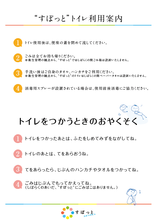 ・ペーパータオル及びごみ箱は設置しませんので、タオル等を必ずご持参ください。