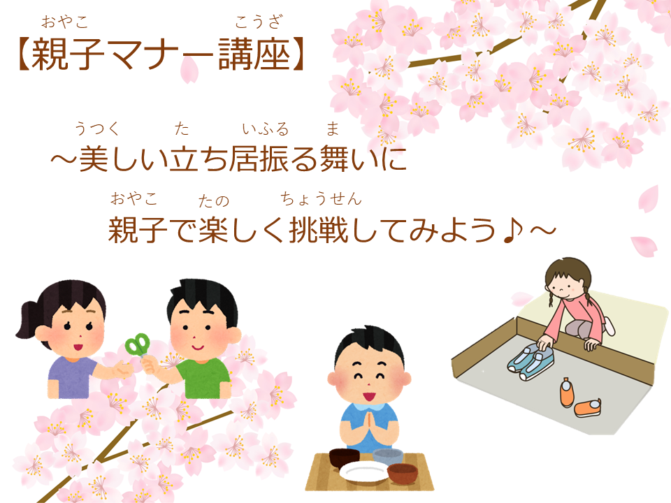 今回のマナー講座は、講師と一緒に親子で実践を交えながら下記内容を楽しく学んでいきます。